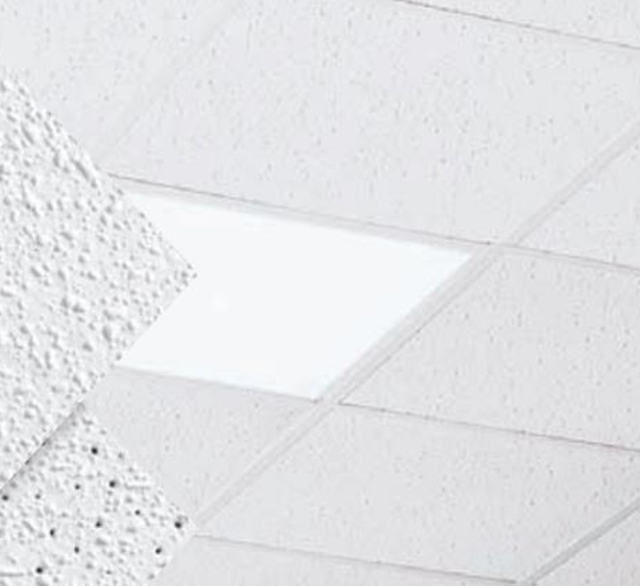 Placa de cielorraso desmontable de fibra mineral con buen comportamiento acústico. Durable, lavable, restregable